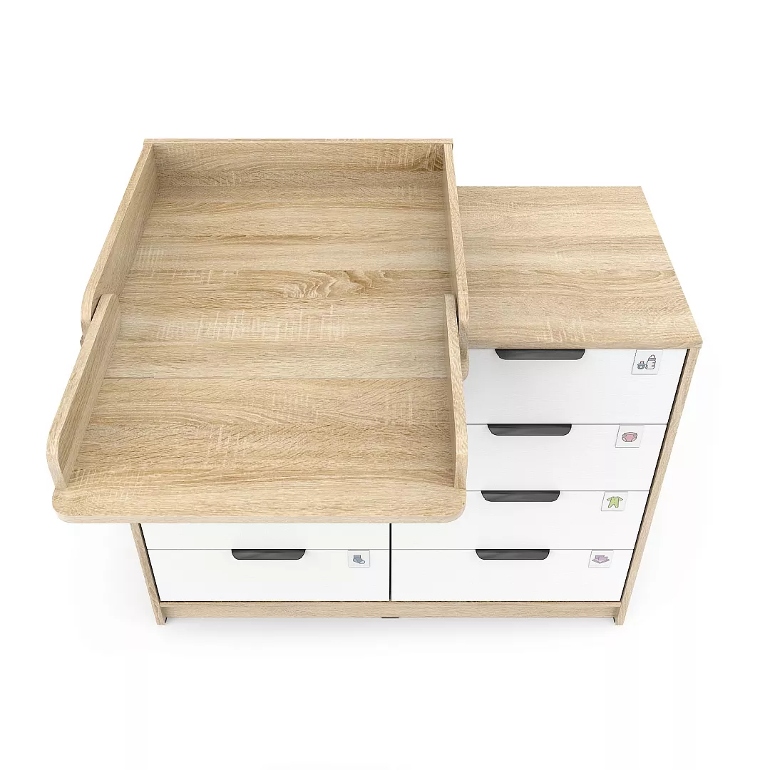 Пеленальный столик снимается и устанавливается одним простым движением, не оставляя никаких следов на столешнице, при этом надежно фиксируется через специальные металлические втулки в задний торец столешницы. Его можно установить в 3 положения - слева, справа и по центру комода. Тем самым, вы сами определяете, с какой стороны останется место для средств по уходу за малышом.