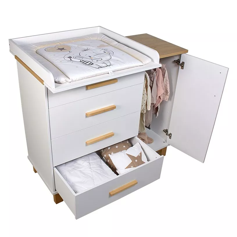 Пеленальная рамка не входит в комплект и продается отдельно. При этом после ее установки на топах комодов остается место, где можно разместить гигиенические принадлежности. Когда потребность в пеленании малыша отпадает, то рамка легко снимается, освобождая место для хранения вещей на топе комодов.